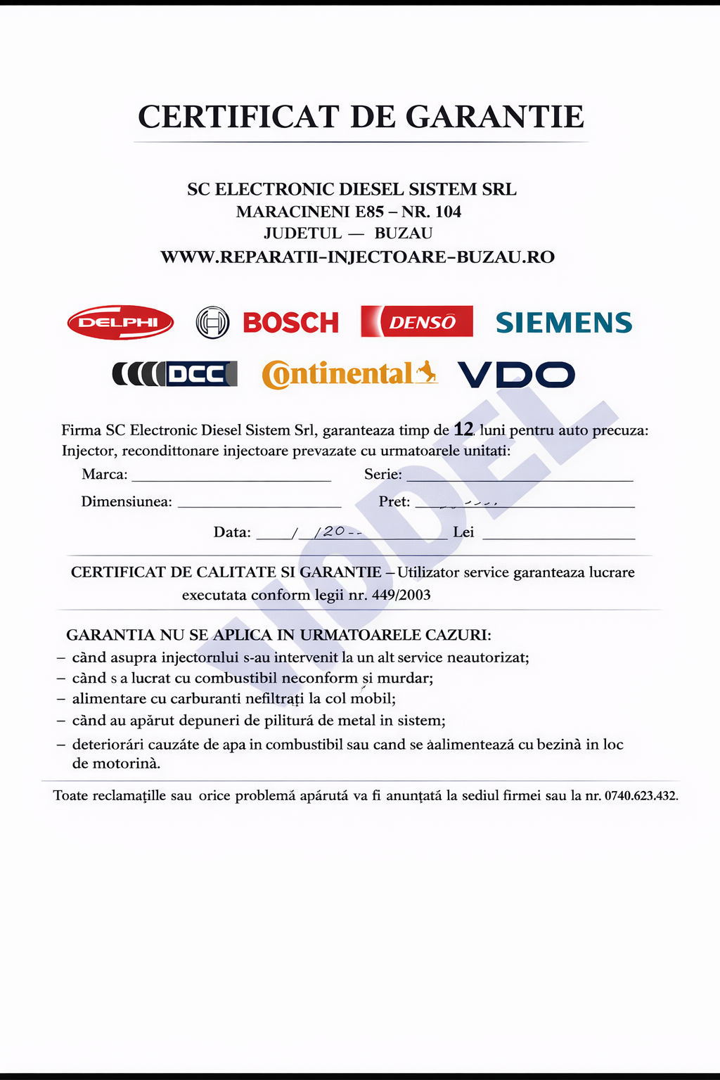 La Reparații Injectoare Buzău, calitatea lucrărilor și siguranța clienților noștri sunt priorități absolute. De aceea, oferim garanție de 12 luni pentru lucrările de reparație și recondiționare a injectoarelor diesel, în condițiile în care intervenția este realizată integral în service-ul nostru.